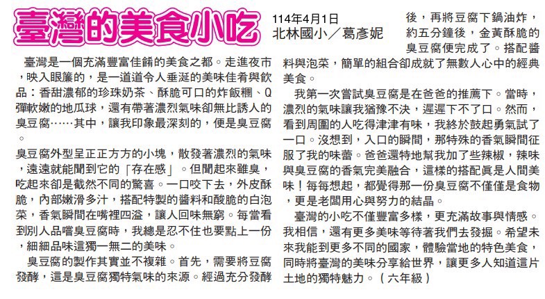 恭喜六年級葛彥妮同學投稿文章獲更生日報兒童天地版刊登