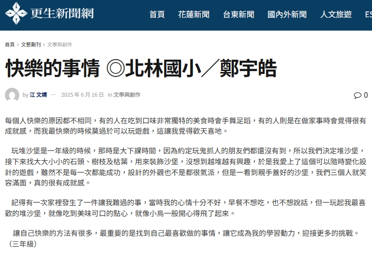 恭喜三年級學生鄭宇皓投稿文章獲更生日報兒童天地版刊登