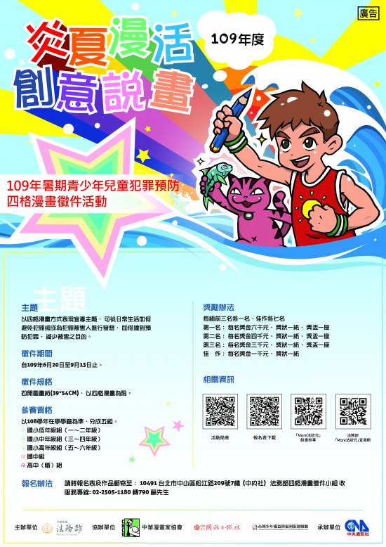 主旨:檢送法務部「炎夏『漫』活,創意說『畫』」109年暑期青少年兒童犯罪預防四格漫畫徵件活動之宣傳海報、簡章等資料。