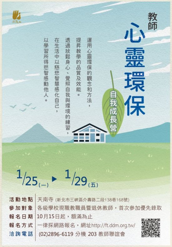 二、研習目的:秉持創辦人聖嚴法師關心教育的精神,以心靈環保的理念和方法,培養學生品德素養,提昇教師教學效能,協助學校順利推動教育工作,舉辦本次成長營。