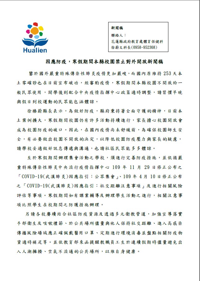 花蓮縣政府「因應防疫,寒假期間本縣校園禁止對外開放」新聞稿1份。