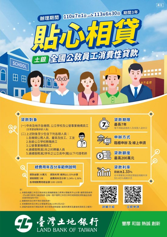 | 四、 | 本貸款辦理方式,請洽臺灣土地銀行各分行辦理。另為使服務更臻完善與便利,借款人亦可透過線上申辦個人信貸業務,於該行「個金單一服務平台」(https://oi.landbank.com.tw/)完成申請、簽約及對保等事宜,洽詢電話:02-2314-6633或0800-231-590。另檢附宣傳海報1張。 |