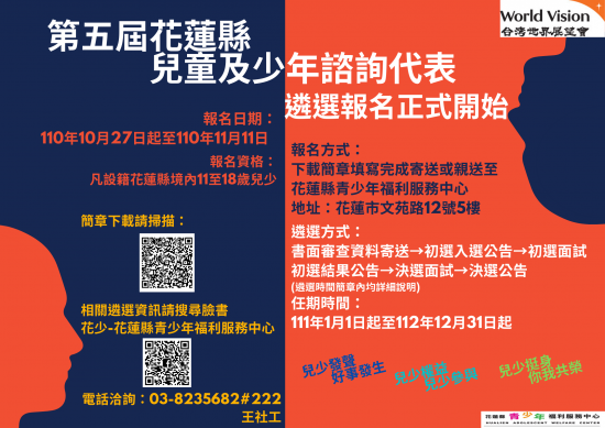 一、 | 為彰顯兒少權益發聲角色,並推動花蓮縣政府重視兒少參與公共事務及公民權利,花蓮縣政府委託財團法人台灣世界展望會辦理花蓮縣兒少諮詢代表培力計畫。 |