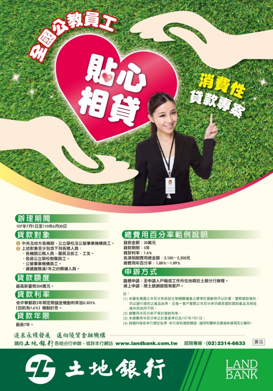 二、 | 「貼心相貸」-全國公教員工消費性貸款(以下簡稱本貸款),原由土地銀行依約承作至107年6月30日止,經重行辦理公開徵選金融機構承作後,由土地銀行再度獲選接續為公教同仁提供服務,辦理期間自107年7月1日起至110年6月30日止,為期3年。 |