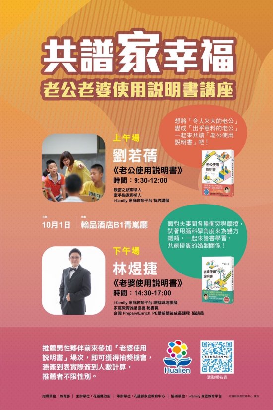 1.地點:花蓮翰品酒店B1青嵐廳 2.時間:111年10月1日(六) 3.上午場:9:30-12:00 老公使用說明書 講師:劉若蒨 https://wp.me/P7Jcsb-1nm 4.下午場:14:30-17:00 老婆使用說明書 講師:林煜捷 https://wp.me/P7Jcsb-aV 歡迎您的蒞臨參加 以下是報名連結 https://reurl.cc/O4ooa9