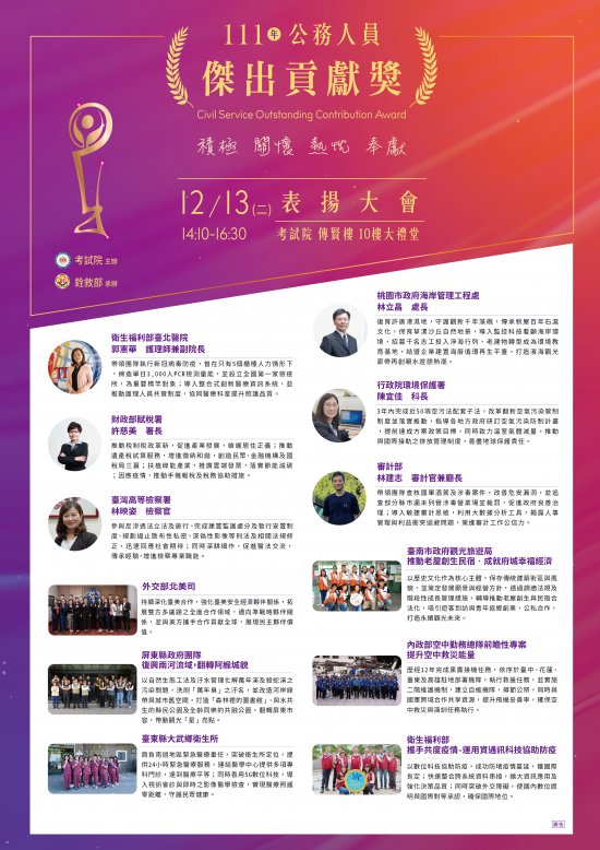 | 二、 | 本(111)年公務人員傑出貢獻獎業經考試院組成評審委員會評選出6名得獎人及6組得獎團體。為表揚得獎者傑出事蹟,考試院訂於本年12月13日(星期二)下午2時10分於考試院傳賢樓10樓大禮堂舉行表揚大會,並同步辦理Facebook網路線上直播。茲檢附「111年公務人員傑出貢獻獎表揚大會」電子海報及得獎者具體事蹟簡介各1份,請惠予公告周知。 |