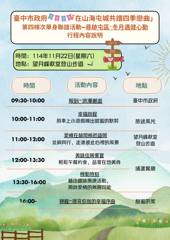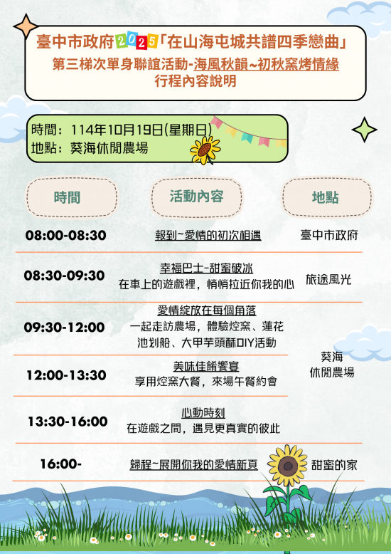二、 | 本年度第三梯次單身員工聯誼活動原訂於10月25日(星期六)舉行,為配合紀念日及節日實施條例制定公布,爰調整至10月19日(星期日)辦理。茲將第三、四梯次相關報名訊息摘要如下: |