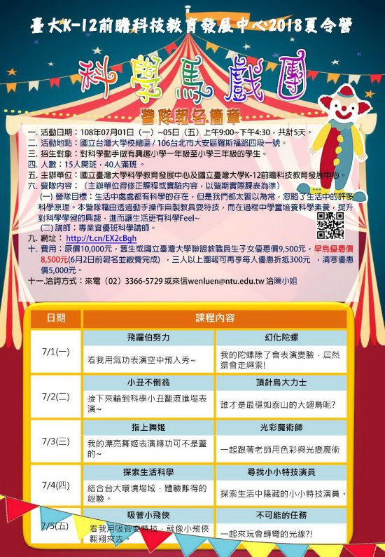 (一)108年7月1日(星期一)至5日(星期五):科學馬戲團(報名網址http://t.cn/EX2cBgh)。