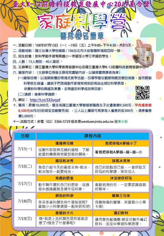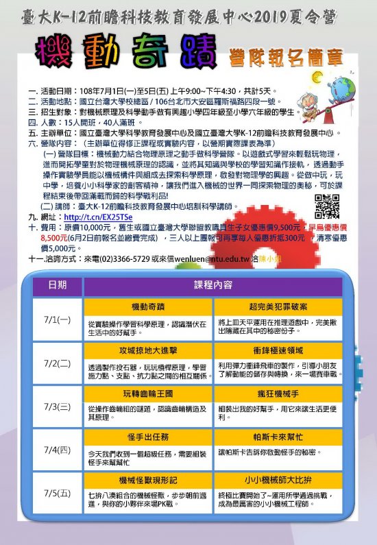 二、國立臺灣大學科學教育發展中心與K-12前瞻科技教育發展中心為推動科學動手做教育,提升中小學學生科學素養與科學視野,訂於今(108)年7月陸續開辦科學營隊活動。