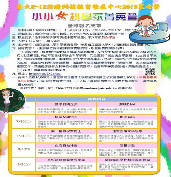 (五)108年7月29日(星期一)至8月2日(星期五):小小女科學家菁英營(報名網址http://t.cn/EX2ghga)。
