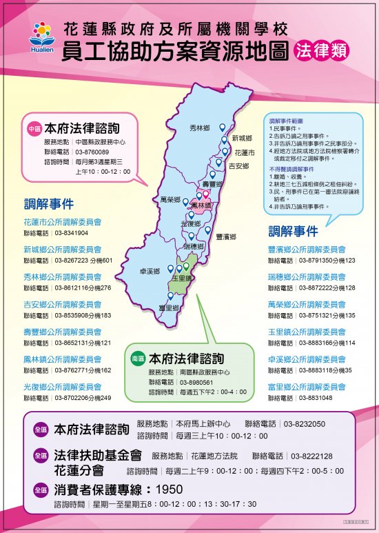 為加強推動花蓮縣員工協助方案,整合相關資源,包含心理諮詢、法律諮詢、醫療諮詢、理財諮詢等,特印製員工協助方案資源地圖宣導海報及資源一覽表摺卡。