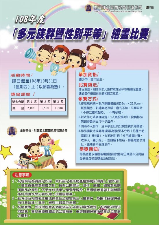 為落實性別主流化之推動,創新推展性別平等概念,財政部北區國稅局花蓮分局舉辦108年度「多元族群暨性別平等」繪畫比賽,收件期間自即日起至108年10月31日(星期四)止,請鼓勵學生踴躍報名參加,並將活動訊息建置於網站或電子看板等,以廣為宣傳,請查照。