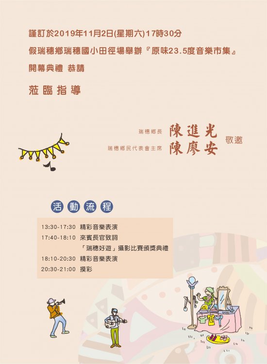 檢附本所辦理「108年瑞穗鄉漫遊經典小鎮原味23.5度音樂市集」DM及邀請卡電子檔,敬請貴單位協助公告宣傳,至紉公誼,請查照。